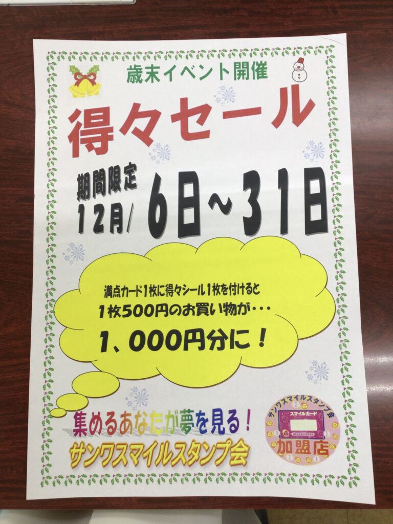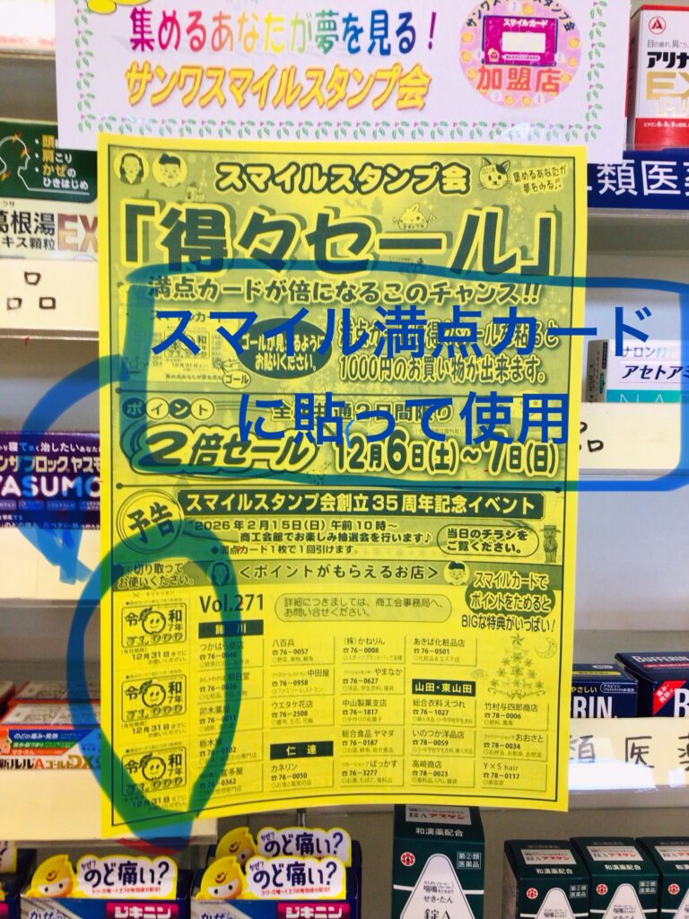 黄色🟡のサンワスマイルスタンプ会のチラシに付いている