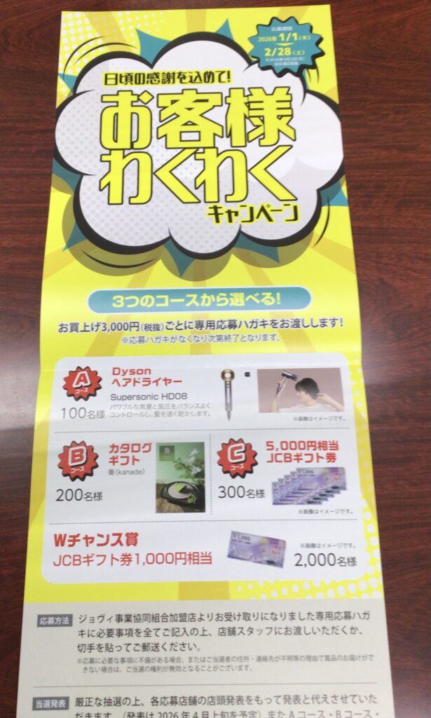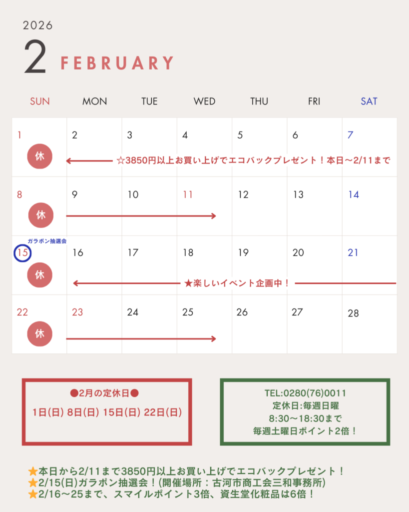 2月のお知らせ📢 %EF%BC%92%E6%9C%88%E3%81%AE%E3%81%8A%E7%9F%A5%E3%82%89%E3%81%9B%F0%9F%93%A2 TOPNEWS2月のお知らせ📢 2026/01/28 2月のお知らせ📢 2/4〜2/11まで、 当店にて¥3850以上お買い上げで 写真のエコバッグを、 おひとつプレゼント🎁 ☆無くなり次第終了となりますのでお早めにご来店お待ちしてます♪ 🉐引き続き2/28まで、ワクワクキャンペーン開催中🎁🤩 一覧へ戻る
