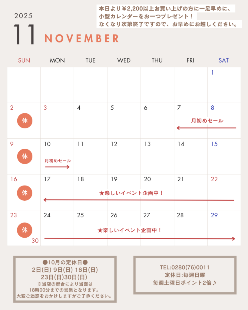 🍇11月のお知らせ🍇 %F0%9F%8D%8711%E6%9C%88%E3%81%AE%E3%81%8A%E7%9F%A5%E3%82%89%E3%81%9B%F0%9F%8D%87 TOPNEWS🍇11月のお知らせ🍇 2025/11/01 🍇11月のお知らせ🍇 応募期間11/1〜30まで 店頭でこのチラシを探して 記載のQRコードから応募してね♪ キーワードなどは店頭で発表です😊 一覧へ戻る