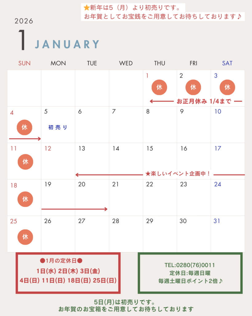 🎍2026年1月のお知らせ🎍 %F0%9F%8E%8D2026%E5%B9%B4%EF%BC%91%E6%9C%88%E3%81%AE%E3%81%8A%E7%9F%A5%E3%82%89%E3%81%9B%F0%9F%8E%8D TOPNEWS🎍2026年1月のお知らせ🎍 2025/12/29 🎍2026年1月のお知らせ🎍 お客さまワクワクキャンペーン開催🤩 期間:1/5〜2/28まで。お買い上げ¥3000税抜毎に応募ハガキをお渡しします♪ *ハガキが無くなり次第終了となります🙇 年明けは1/5(月)から営業いたします。お年賀にお宝銭をご用意してお待ちしております♪ 定休日: 1(木)〜4(金)、11(日)、 18(日)、25(日) 一覧へ戻る